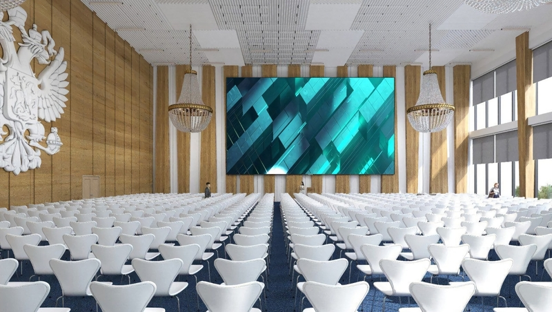 В каждом зале установят необходимую технику: микрофоны, экраны, акустические системы. А в одном из них расположатся перегородки для трансформации пространства под различные нужды.