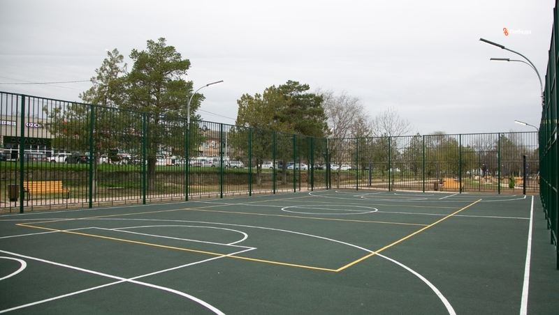 В спортивных зонах уложили резиновое покрытие и смонтировали освещение. Установили оборудование для занятий баскетболом, футболом и волейболом.